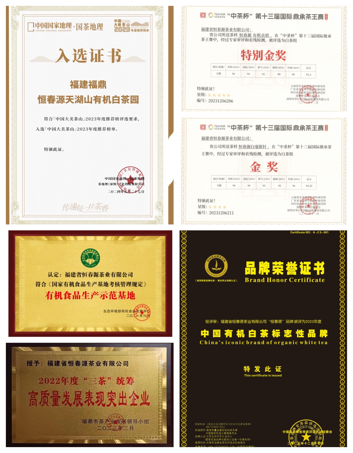 在各類茶王賽和斗茶賽中,恒春源茶業(yè)屢獲殊榮。例如,在寧德市第八屆茶王賽中榮獲白牡丹銀獎(jiǎng);在寧德市第九屆茶王賽中榮獲貢眉銀獎(jiǎng);在第二屆福鼎白茶斗茶賽中榮獲優(yōu)質(zhì)獎(jiǎng)、2021年,“恒春源牌白毫銀針”榮獲“中茶杯”第十一屆國(guó)際鼎承茶王賽秋季賽金獎(jiǎng),展示了恒春源茶業(yè)在白茶品質(zhì)上的卓越表現(xiàn)。2022年,恒春源有機(jī)白毫銀針再次榮獲“中茶杯”的榮譽(yù),證明了其產(chǎn)品的持續(xù)高品質(zhì)和品牌的卓越影響力等。這些榮譽(yù)的獲得展示了恒春源茶業(yè)在茶葉品質(zhì)方面的卓越表現(xiàn)。