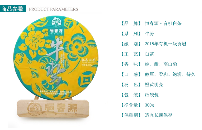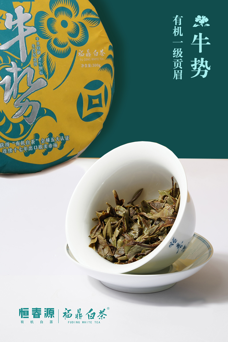 牛勢(緊壓白茶) 零售價:1060元/餅 5300元/提 年份:2018年 等級:有機一級貢眉 凈含量:300克/餅 1500克/提 裝箱量:10餅/件(5餅/提)