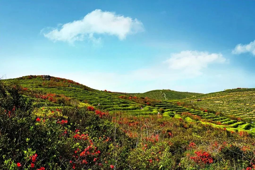 春之海,是萬物復(fù)蘇的杜鵑花海。漫山野杜娟紅遍了整個(gè)天湖山,有如紅寶石項(xiàng)鏈環(huán)繞頸項(xiàng)。漫步在茶園間,仿佛置身于一片生機(jī)盎然的海洋中,讓人感受到春天的氣息和生命的活力。