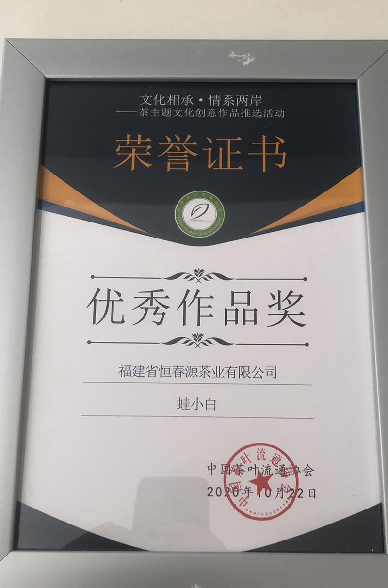 2020年10月22日,恒春源公司“蛙小白”系列產(chǎn)品在由中國茶葉流通協(xié)會主辦的“文化相承·情系兩岸活動中榮獲”優(yōu)秀作品獎“
