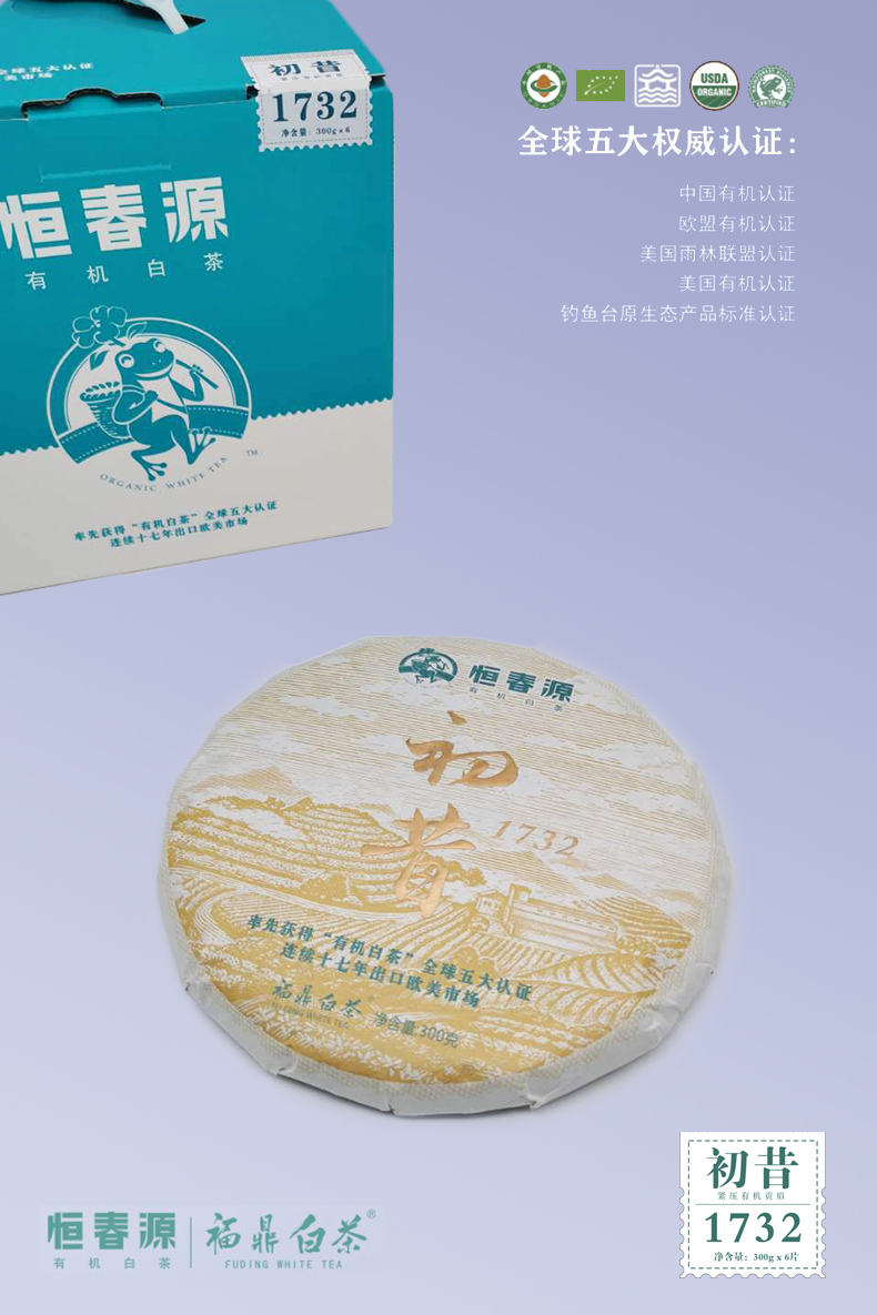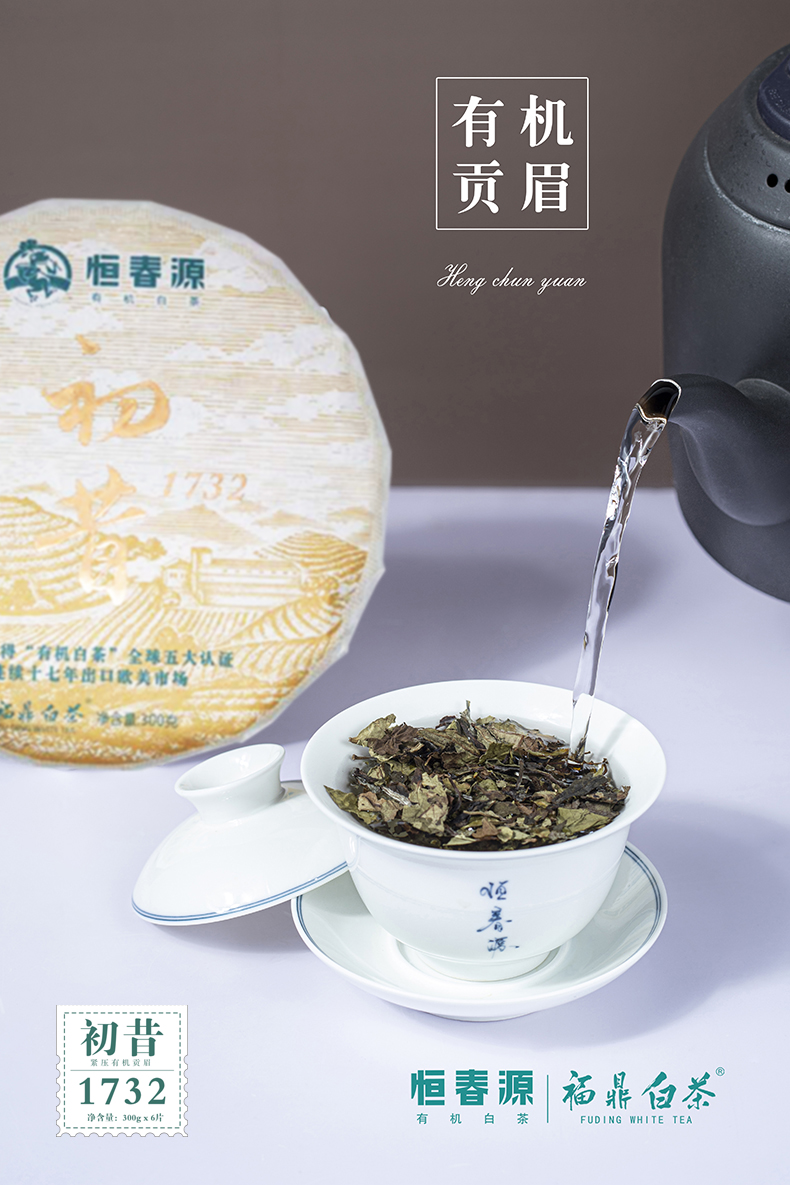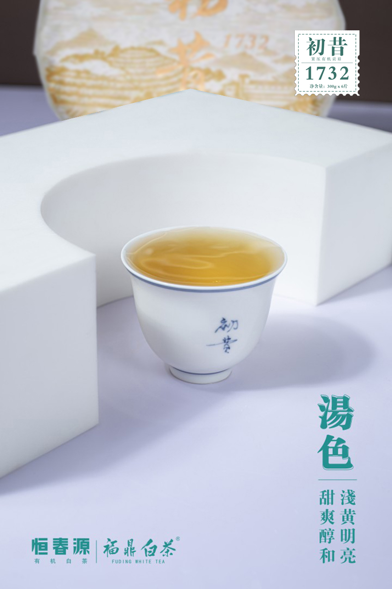 產(chǎn)品名稱:初昔1732(緊壓白茶) 全國統(tǒng)一零售價:1260元/餅 配 料:2017年有機一級貢眉 凈 含 量:300g 生產(chǎn)日期:見噴碼 保 質(zhì) 期:適宜長期保存,十五年之內(nèi)飲用最佳 貯存方法:密封、避光、防潮、防異味