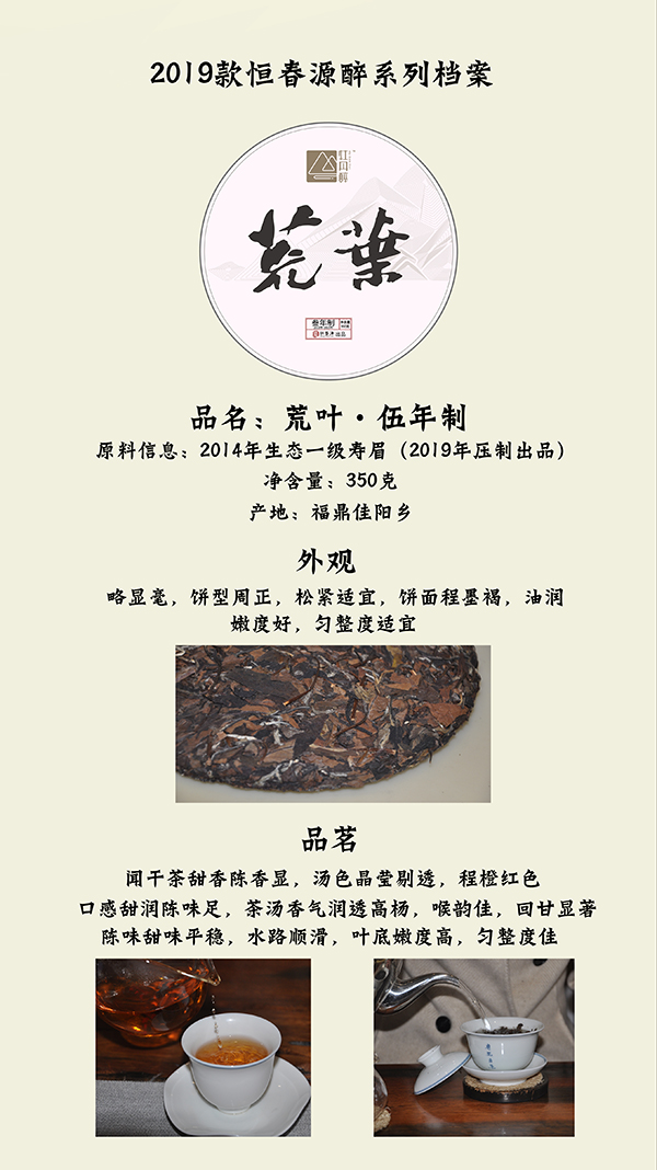 出品時間:2019年3月18日恒春源公司選用來自2014年4月28日所出品的佳陽茶廠壽眉原料精心制作而成。