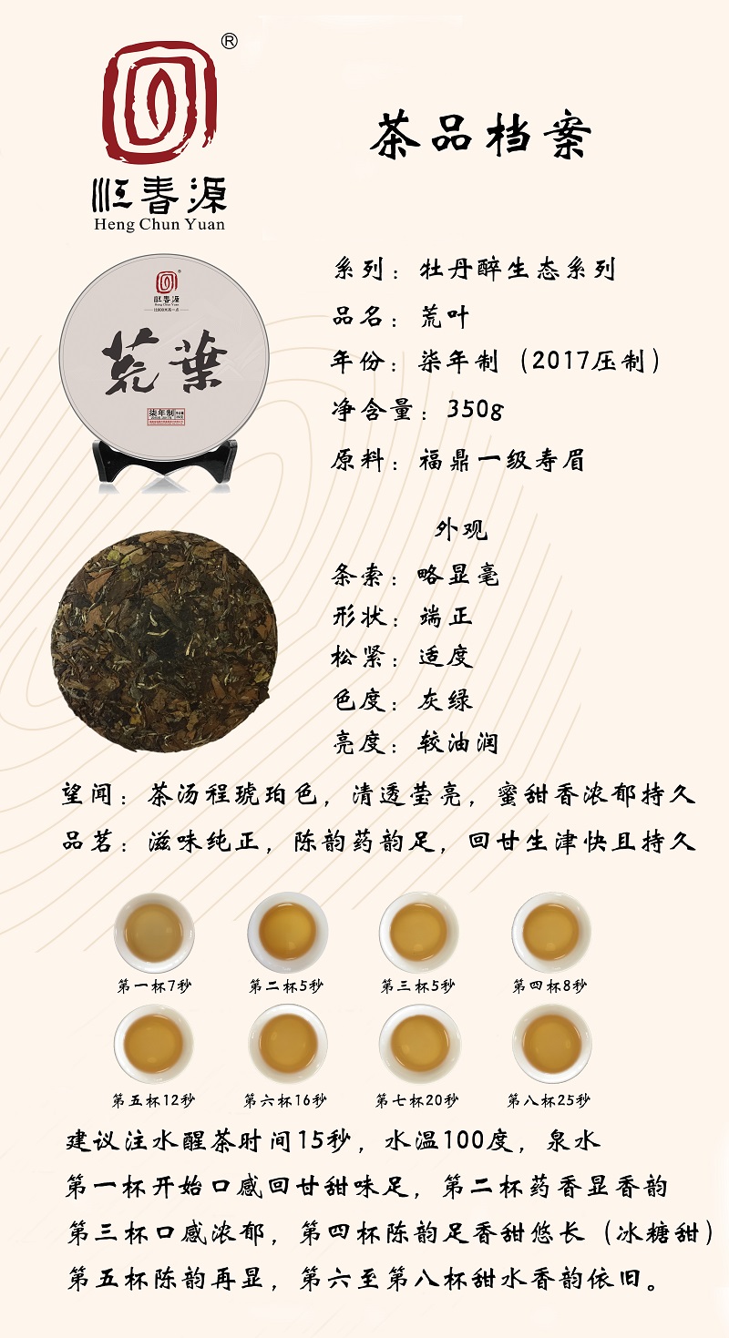 出品時間:2017年5月18日恒春源公司選用來自2010年4月28日所出品的佳陽茶廠壽眉原料精心制作而成。
