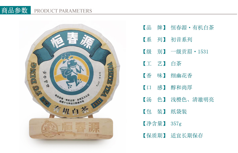 產(chǎn)品名稱:初昔1531(緊壓白茶) 全國統(tǒng)一零售價:2180元/餅 配 料:2015年一級貢眉 凈 含 量:357g 生產(chǎn)日期:見噴碼 保 質(zhì) 期:適宜長期保存,十五年之內(nèi)飲用最佳 貯存方法:密封、避光、防潮、防異味
