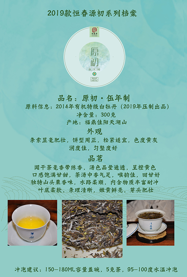 出品時(shí)間:2019年3月1日恒春源公司選用來自2014年3月27日所出品的天湖山有機(jī)特級(jí)白牡丹原料精心制作而成。